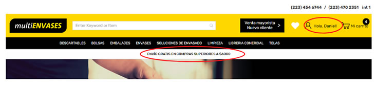 2- TU NOMBRE aparecerá en el margen superior derecho, una vez realizado este paso aparecerán las promociones de envios correspondientes a tu categoría de cliente, avances de tu compra e historial de tus intereses. Haciendo un click en "TU NOMBRE" accederás a un panel personalizado de tu historial y tus intereses.